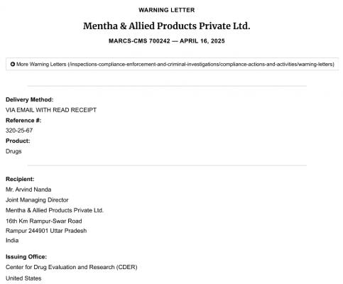 FDA對印度Mentha & Allied Products Private Ltd.的警告信