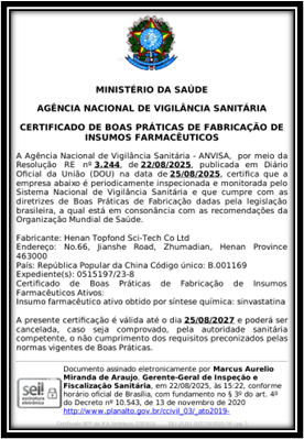 熱烈祝賀河南天方科技有限公司通過巴西ANVISA的現(xiàn)場檢查并獲得巴西ANVISA頒發(fā)的GMP證書!